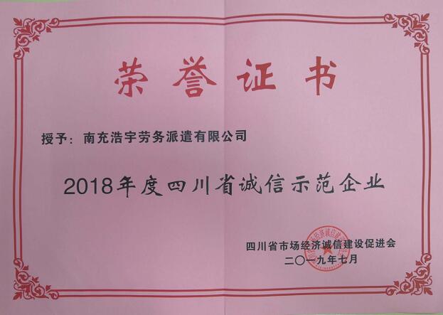 我公司獲得2018年度四川省誠(chéng)信示范企業(yè)